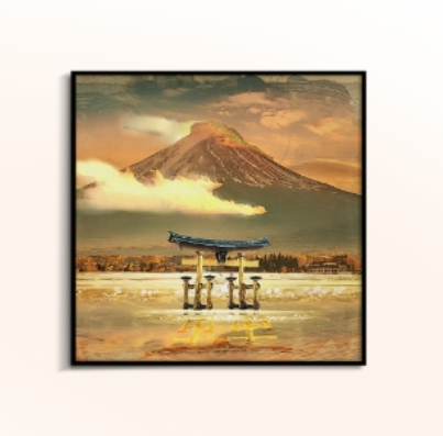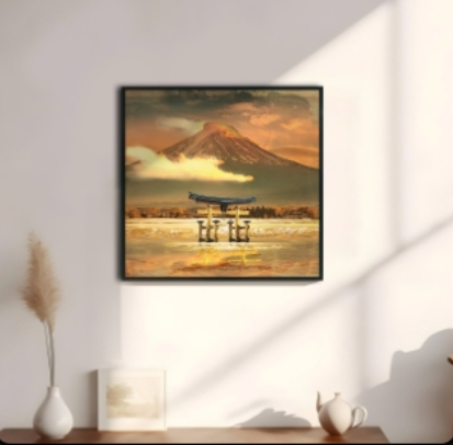 Bức tranh tái hiện hình ảnh cổng Torii thiêng liêng đứng hiên ngang dưới ánh sáng bao phủ của núi Phú Sĩ – ngọn núi linh thiêng và biểu tượng hùng vĩ của đất nước Nhật Bản. “Torii in the Light of Fuji” không chỉ là một cảnh vật tĩnh lặng mà còn gợi mở tinh thần truyền thống và sự giao thoa giữa con người và thiên nhiên. Ánh sáng trong tranh mang tính biểu tượng, như một luồng năng lượng tinh khiết dẫn lối tâm hồn về cội nguồn.