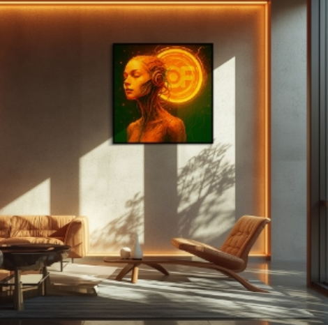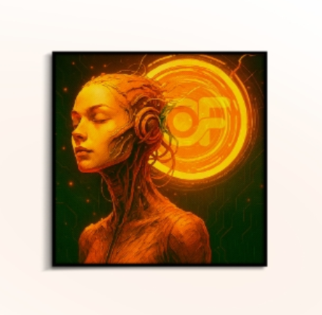 Bức tranh là khoảnh khắc giao thoa kỳ diệu giữa cảm xúc con người và nhịp đập dữ liệu. Ở đó, ranh giới giữa trí tuệ tự nhiên và trí tuệ nhân tạo trở nên mờ nhòe. Nhân vật nữ được khắc họa như một thực thể lai giữa con người và máy móc, hòa mình vào vòng xoáy ánh sáng blockchain – biểu tượng cho kết nối, tái sinh và lan truyền thông tin. “Resonance” không chỉ là một hình ảnh – mà là bản giao hưởng thầm lặng giữa ý thức con người, công nghệ chuỗi khối và hệ sinh thái số. Một thế giới nơi cảm xúc cũng có thể được mã hóa, và sự cộng hưởng là chiếc chìa khóa để chạm đến tương lai.